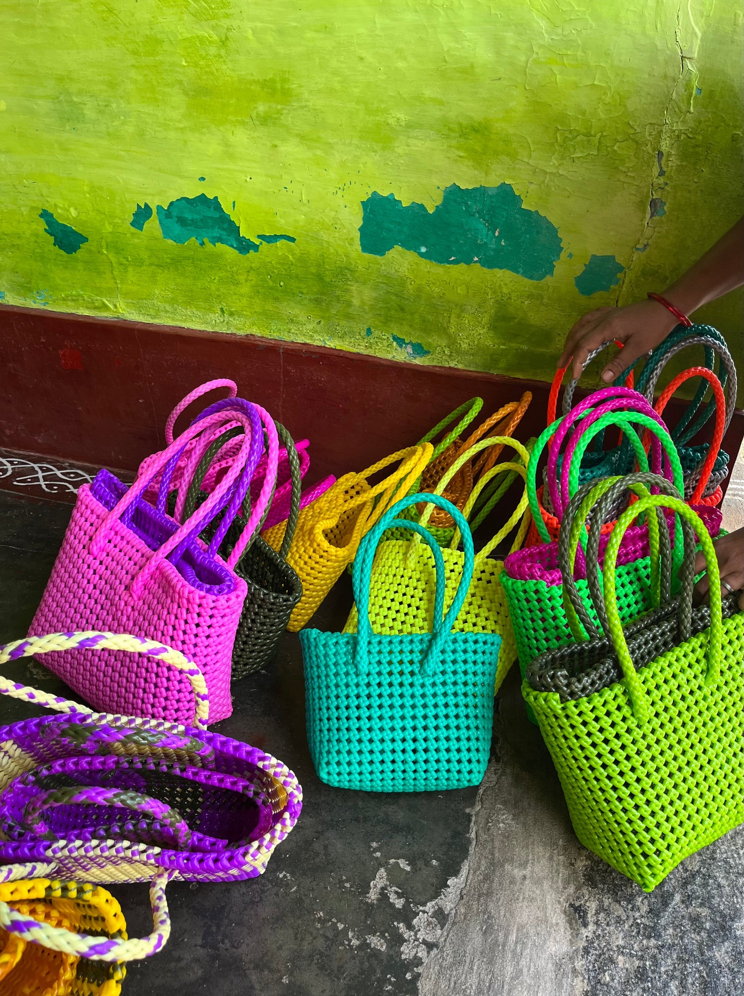 N°88XS - SAC CABAS TRESSÉ MAIN - MINI - violet & rose fluo