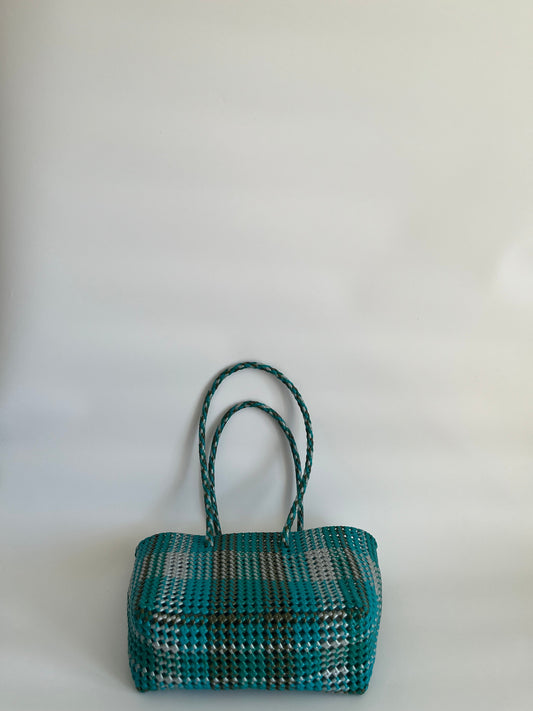 N°49S - SAC PANIER TRESSÉ MAIN - PETIT - vert fluo & bleu foncé