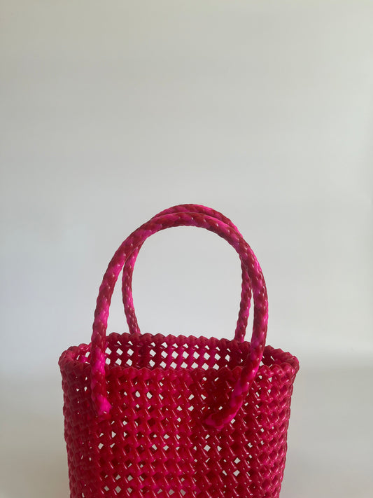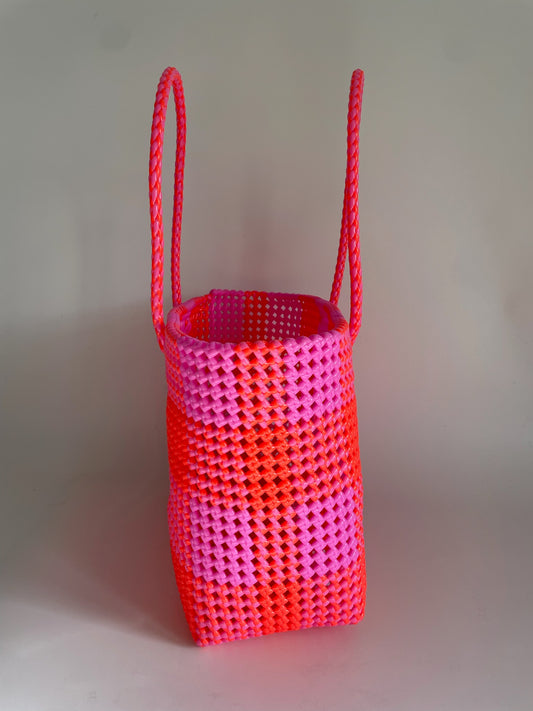 N°114XS - SAC CABAS TRESSÉ MAIN - MINI - rose fluo & rouge