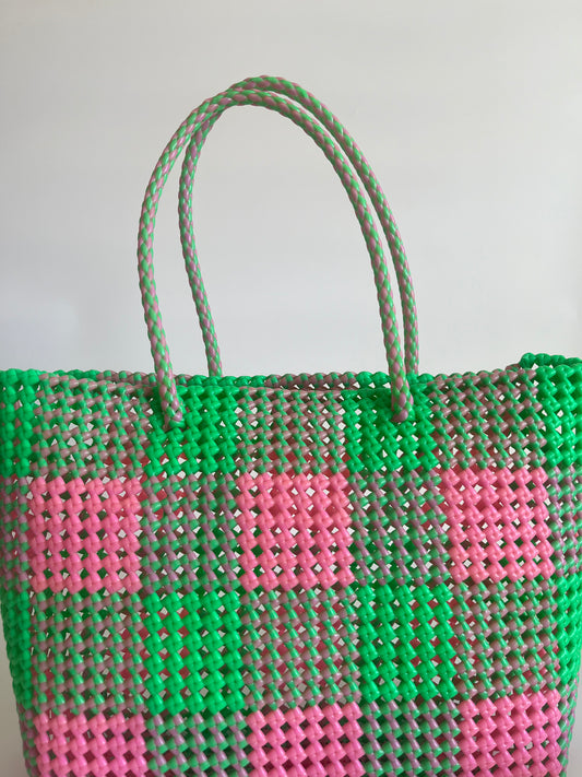 N°105L - SAC CABAS TRESSÉ MAIN - GRAND - rose clair & vert fluo