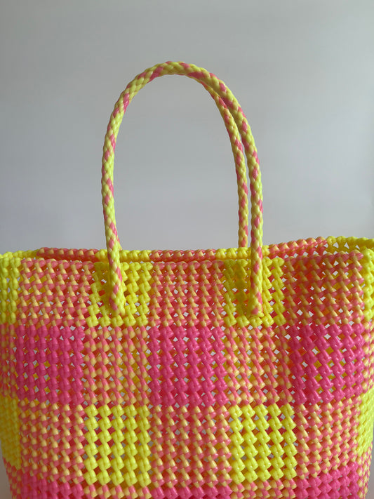 N°106L - SAC CABAS TRESSÉ MAIN - GRAND - rose clair & jaune fluo