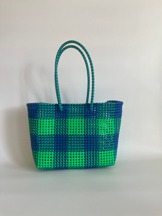 N°49L - SAC CABAS TRESSÉ MAIN - GRAND - vert fluo & bleu foncé