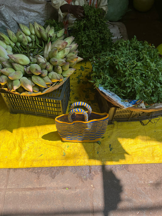 N°2SC - SAC PANIER CROCHET STRIE S - PETIT - bleu foncé & moutarde