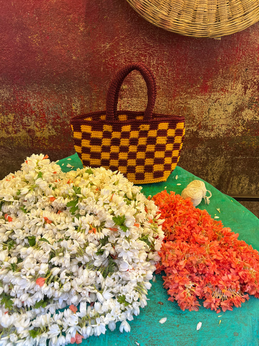 N°3SC - SAC PANIER CROCHET DAMIER S - PETIT - bordeaux & moutarde