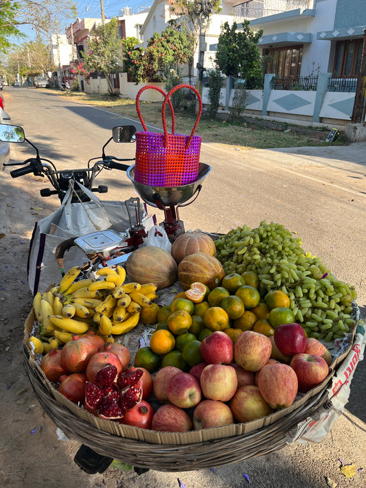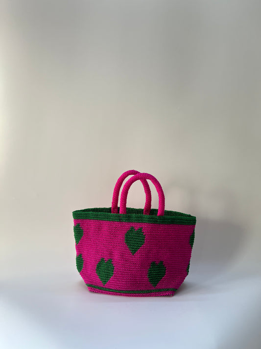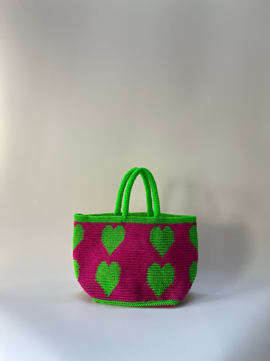 N°10SC - SAC PANIER CROCHET COEUR M - MOYEN - rose fluo & vert