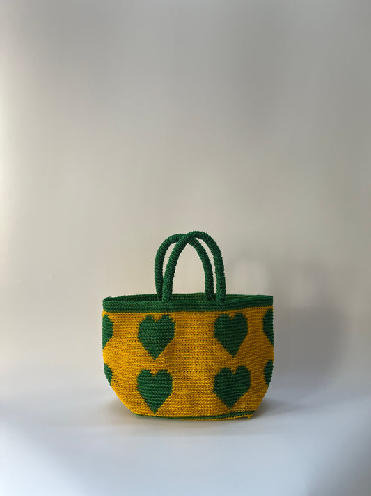 N°11SC - SAC PANIER CROCHET COEUR M - MOYEN - vert & jaune
