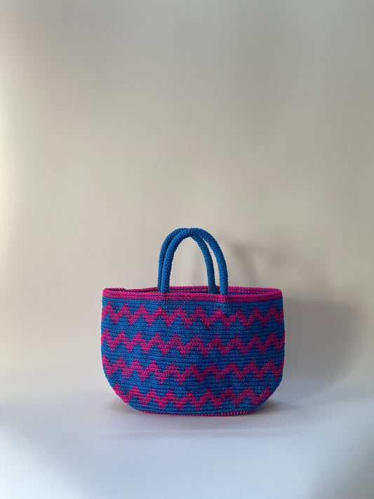 N°9SC - SAC PANIER CROCHET ZIGZAG L - GRAND - rose fluo & bleu clair
