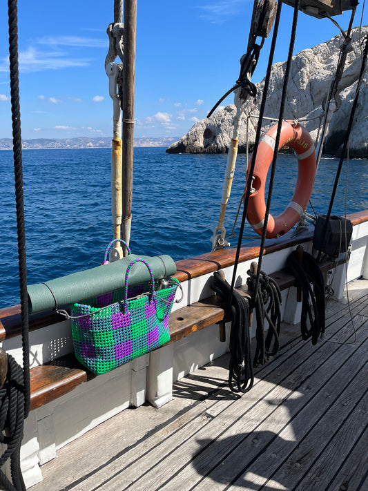 N°2L - SAC CABAS TRESSÉ MAIN - GRAND - vert fluo & violet