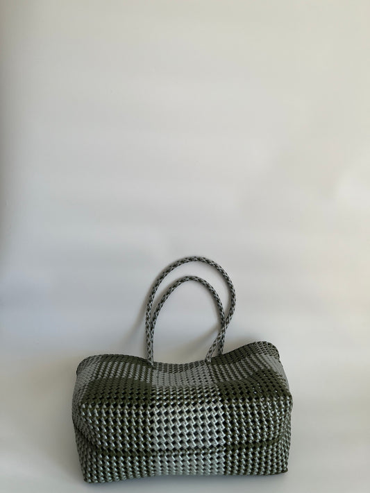 N°208L bis - SAC PANIER TRESSÉ MAIN - GRAND - kaki & argenté