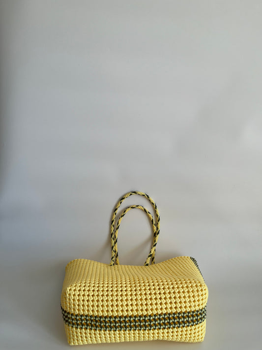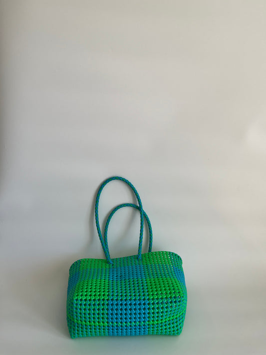 N°220M - SAC PANIER TRESSÉ MAIN - MOYEN - bleu clair & vert fluo