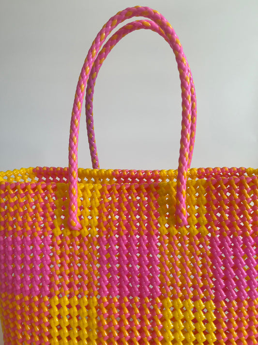 N°24L - SAC PANIER TRESSÉ MAIN - GRAND - jaune & rose clair