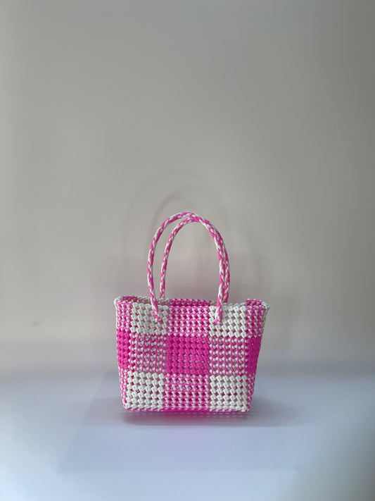 N°26XS - SAC PANIER TRESSÉ MAIN - MINI - rose clair & rose fluo