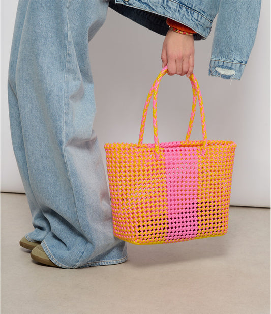 N°24M bis - SAC PANIER TRESSÉ MAIN - MOYEN - jaune & rose clair