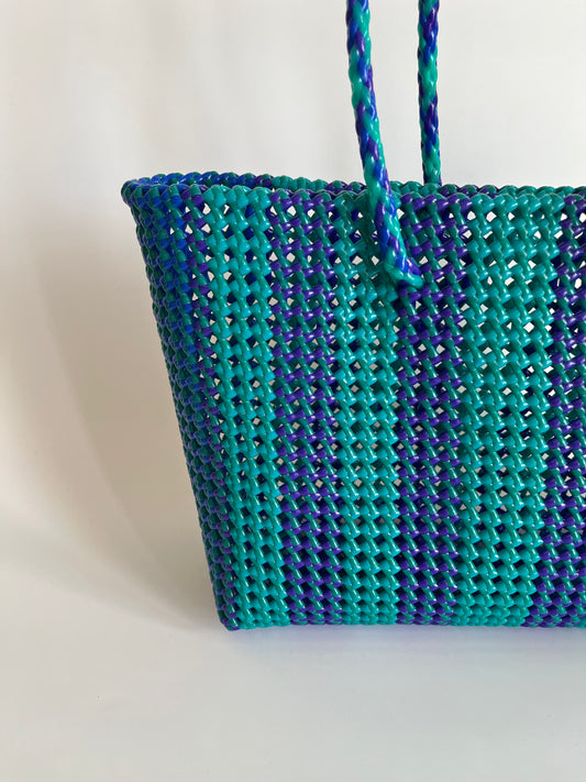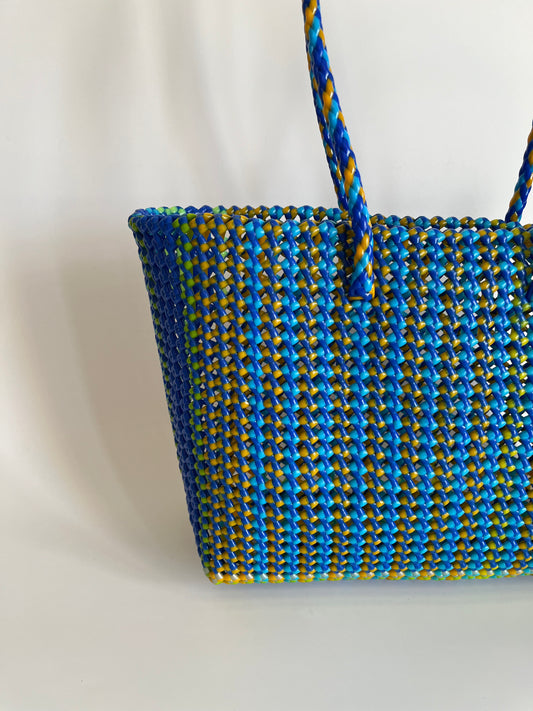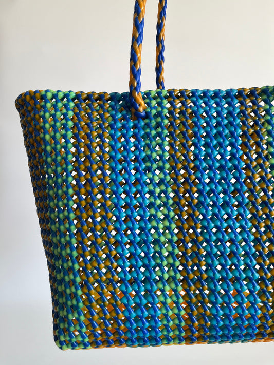 N°49L - SAC PANIER TRESSÉ MAIN - GRAND - vert fluo & bleu foncé