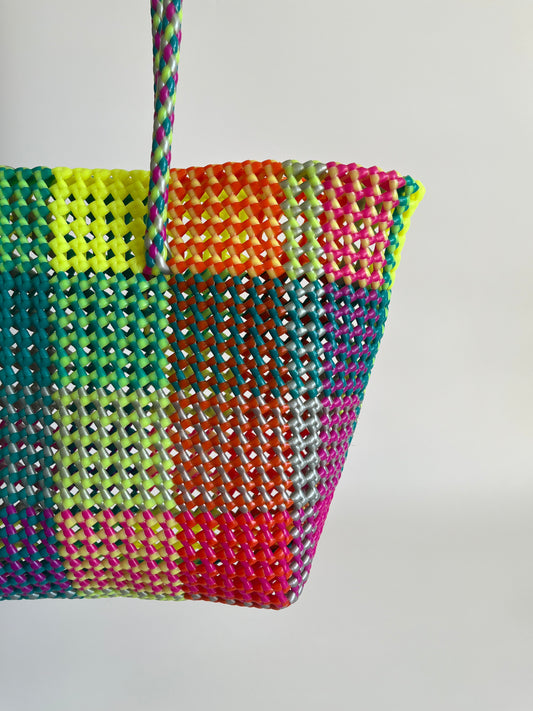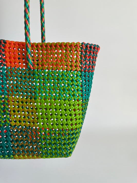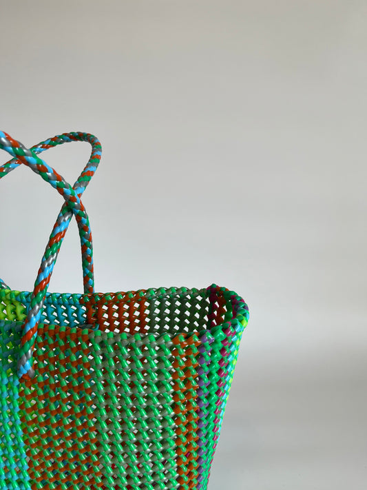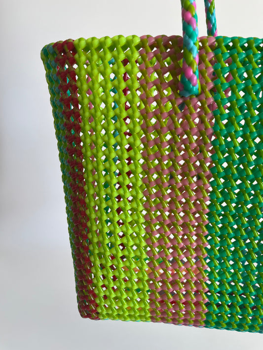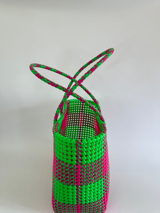 N°20L - SAC PANIER TRESSÉ MAIN - GRAND - vert fluo & rose fluo