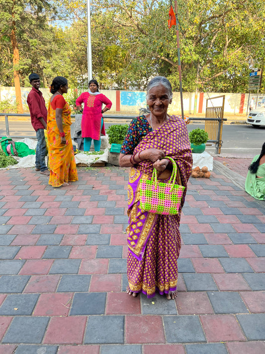 N°2XS - SAC PANIER TRESSÉ MAIN - MINI - vert fluo & violet