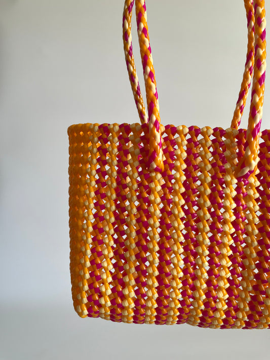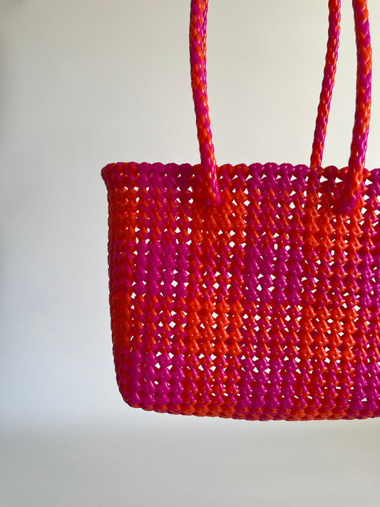 N°97S bis - SAC PANIER TRESSÉ MAIN - PETIT - rose foncé & orange