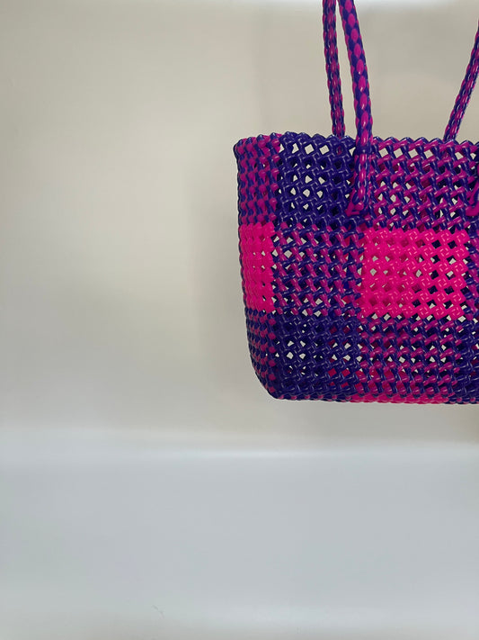 No. 12S - Hand-braided basket bag - small - dark blue & neon pink