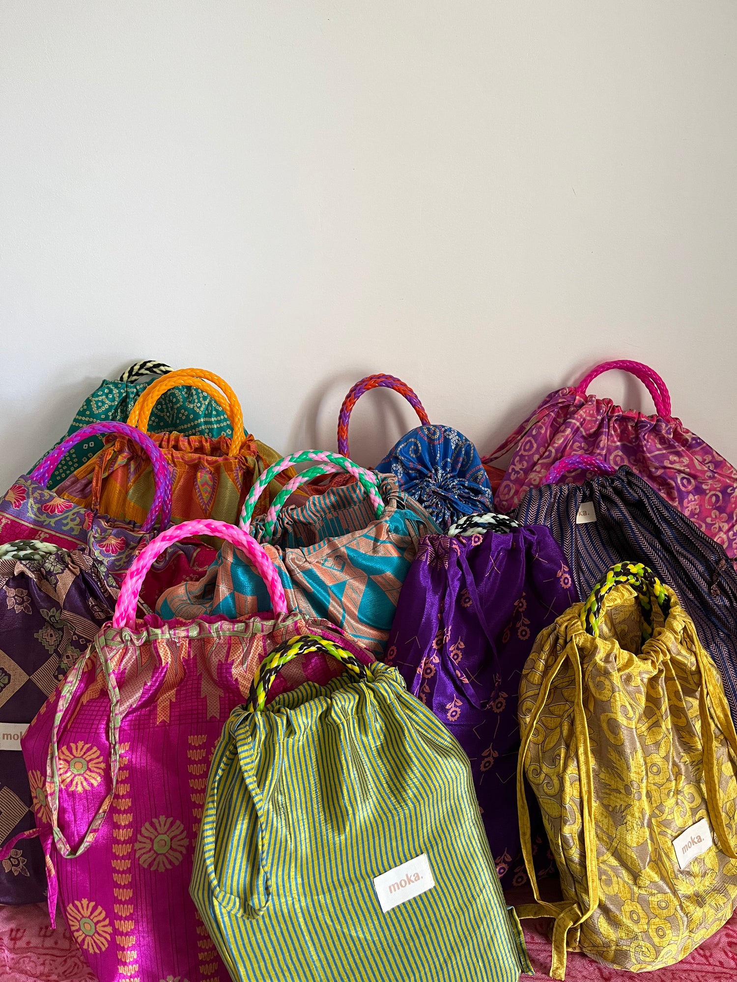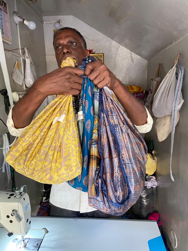 En quête de praticité, j'ai collaboré avec un artisan couturier pour créer des pochons en soie à partir de saree, la tenue traditionnelle des femmes indiennes.