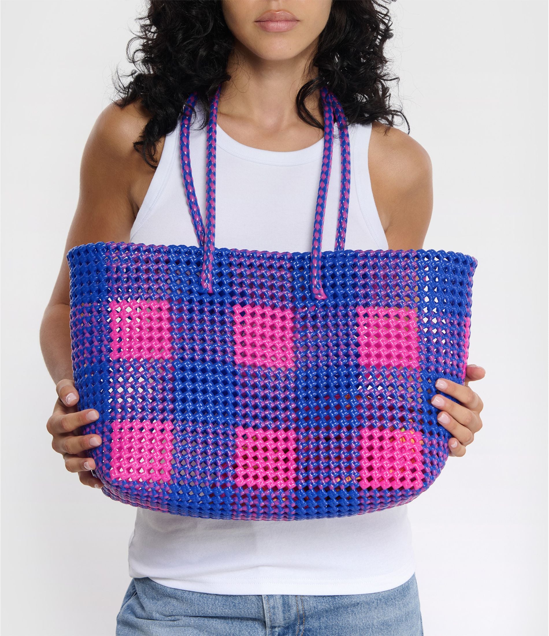 N°15L - SAC CABAS TRESSÉ MAIN - GRAND - rose fluo & bleu foncé
