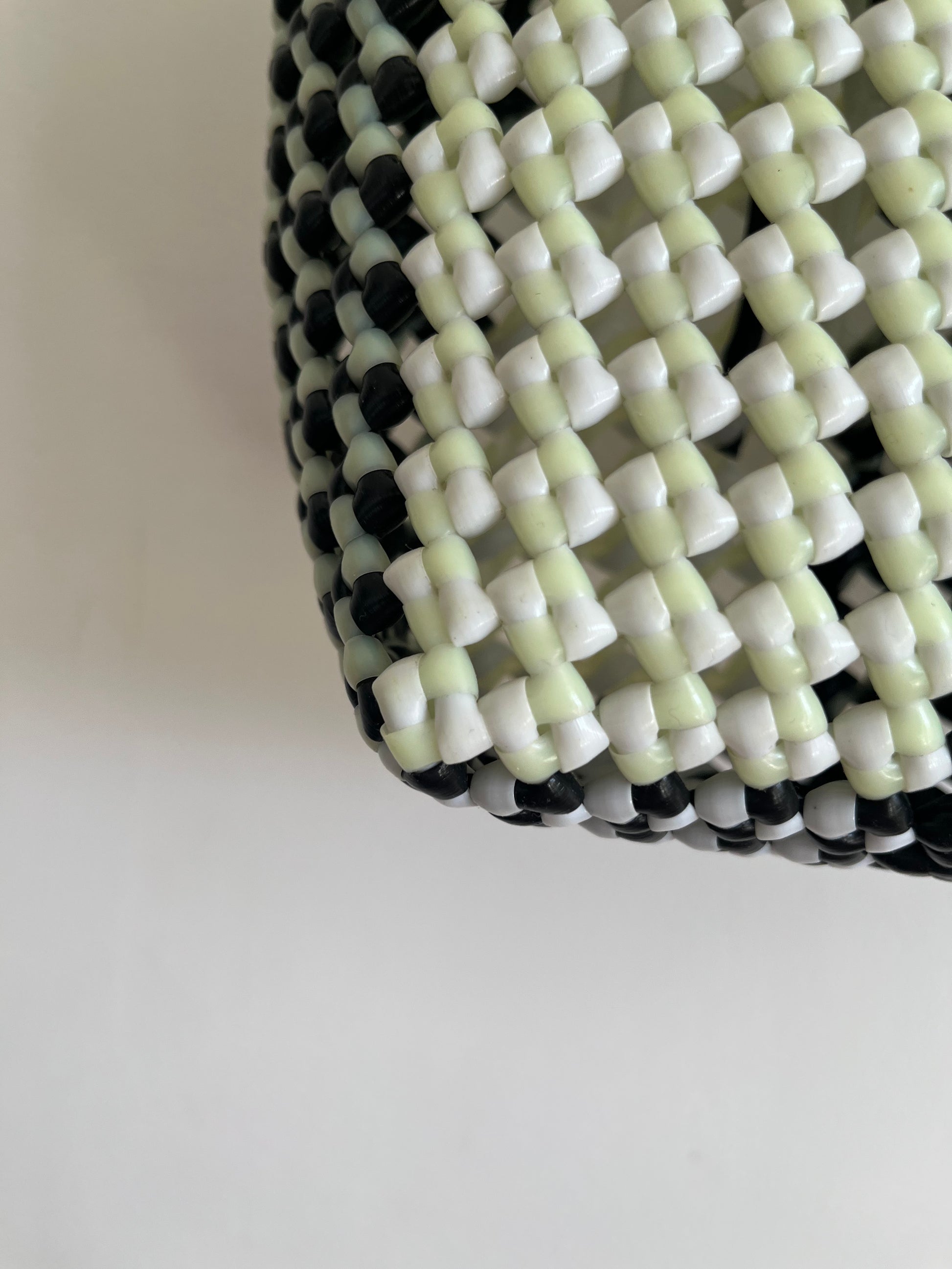 Fait main • Créations uniques • Plastique et soie recyclés • Artisanat durable • Projet éthique & solidaire • Personnalisable • Pochon intérieur en soie • Résistant & waterproof • Tressé en 2-4h • Dimensions : environ 21 × 17 × 10 cm