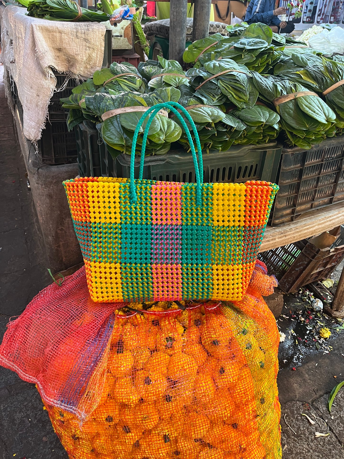 En quête de praticité, j'ai collaboré avec un artisan couturier pour créer des pochons en soie à partir de saree, la tenue traditionnelle des femmes indiennes. Ces pochons, qui enveloppent le sac à l'achat, peuvent être placés à l'intérieur du panier et fixés avec des attaches latérales, ajoutant une touche pratique à l'esthétique artisanale..