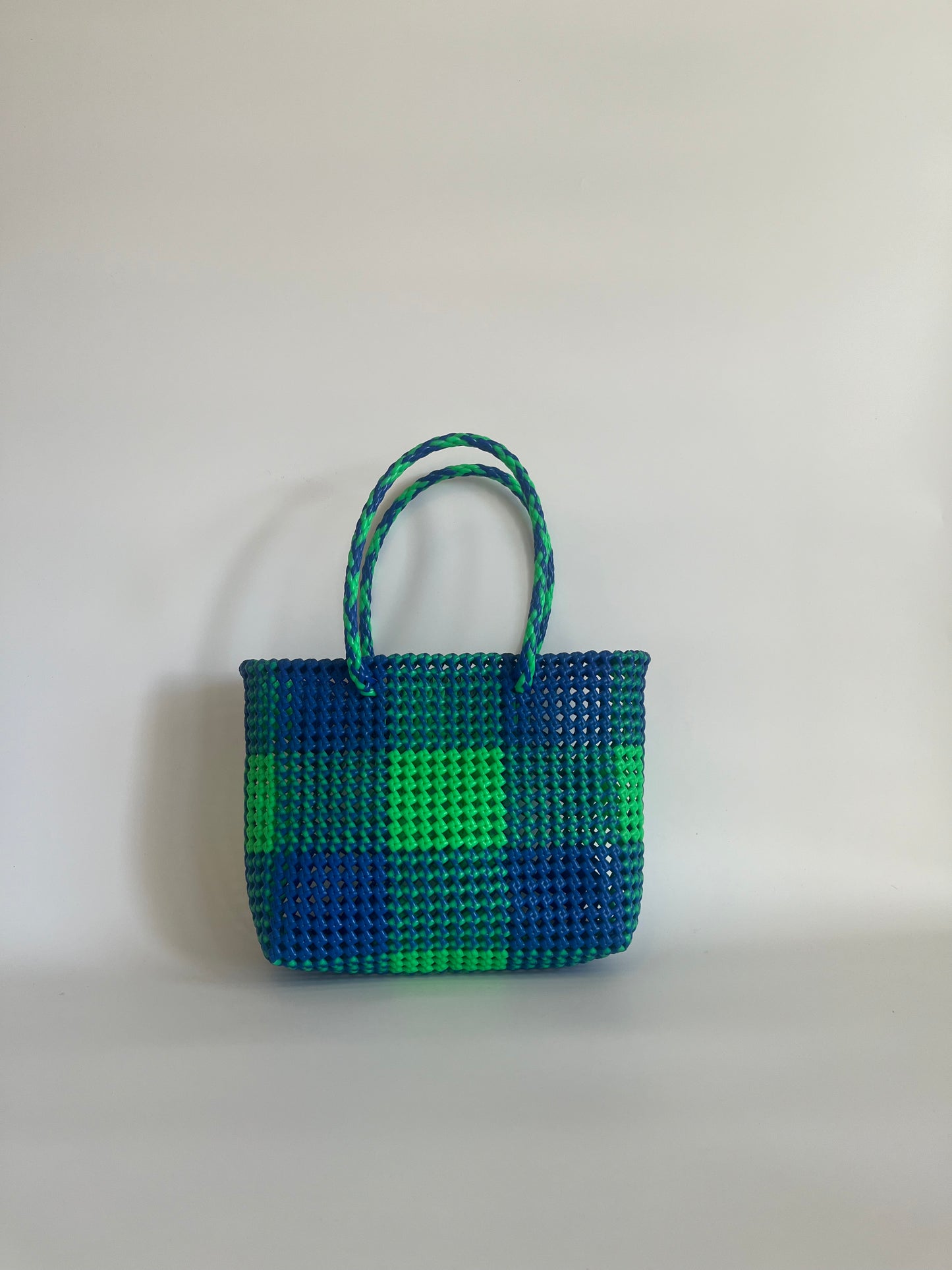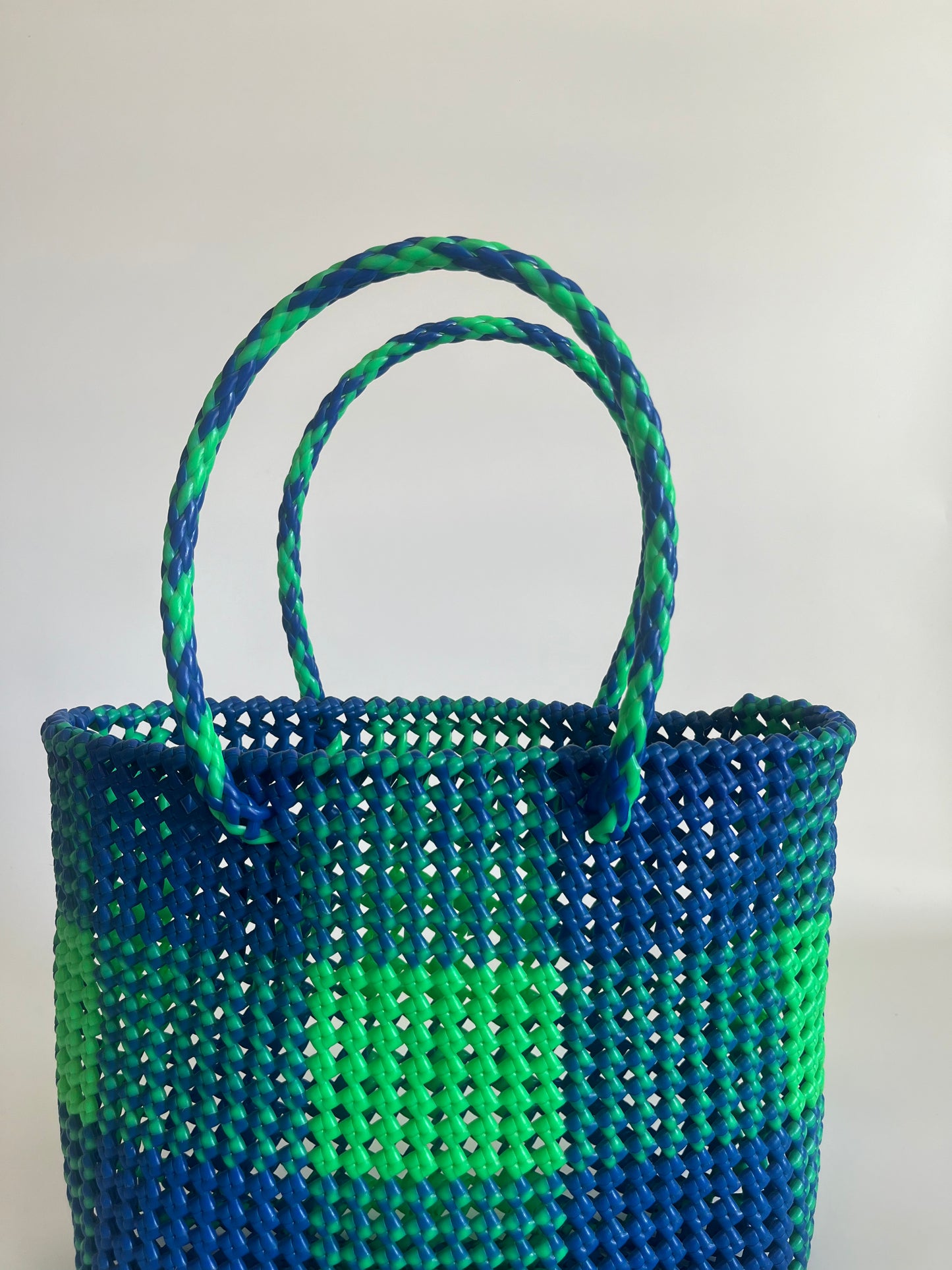 N°49M - SAC CABAS TRESSÉ MAIN - MOYEN - vert fluo & bleu foncé
